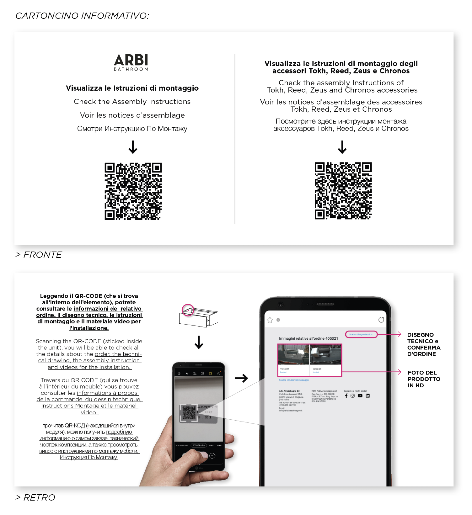 Sul fronte sono riportati i QR code che rimandano ai pdf delle istruzioni di montaggio Arbi. Sul retro, invece, è indicato come poter visualizzare ulteriori informazioni relative al mobile acquistato.